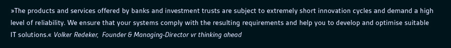 Our FINANCIAL SOFTWARE ENGINEERING division offers specialised IT consultancy and software development services for banks and investment companies. Interfacing between specialists and software service providers, we generate the future-proof IT solutions you need. Guided by our company’s slogan – »we are thinking ahead« – we always ensure that our solutions are reliable, flexible and cost-efficient.